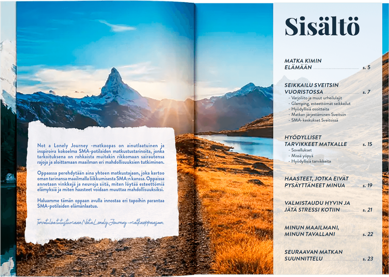 Ensimmäinen Not a Lonely Journey matkaopas on valmis ja saatavilla pdf-muodossa. Se on kirjoitettu yhdessä SMA:ta sairastavien ja matkailutoimittajien kanssa. Opas tarjoaa inspiroivia ja käytännöllisiä neuvoja liikuntarajoitteisille matkailijoille, jotka haluavat nähdä enemmän maailmaa. Tutustu Kimin matkaan Sveitsissä alla olevan linkin kautta: